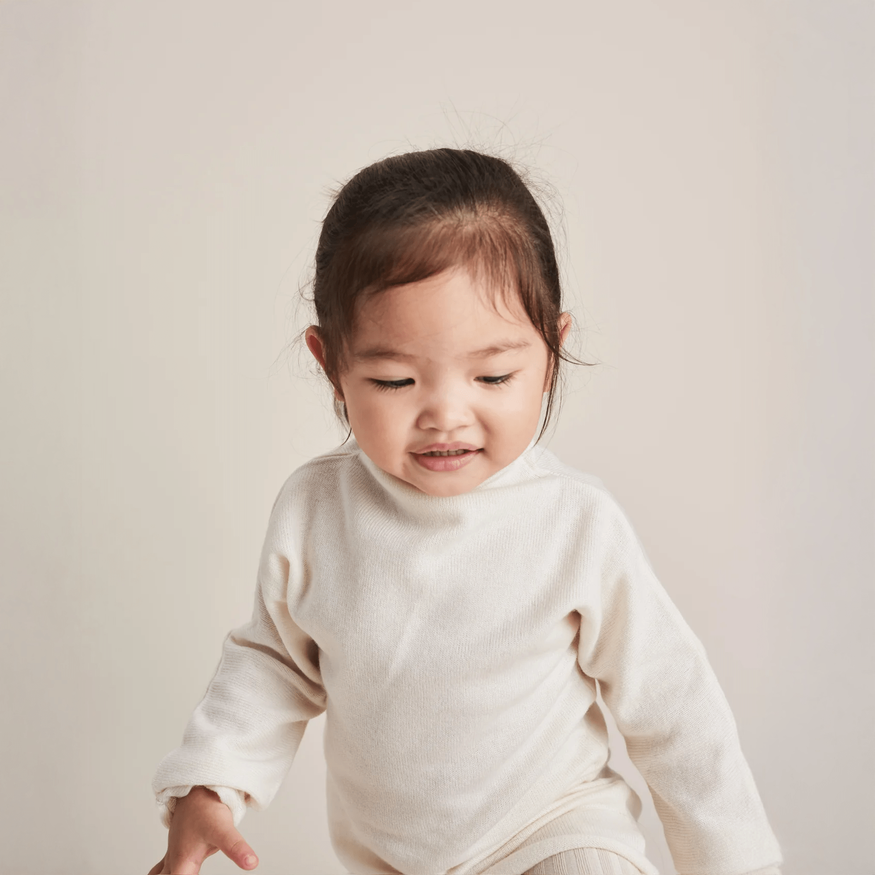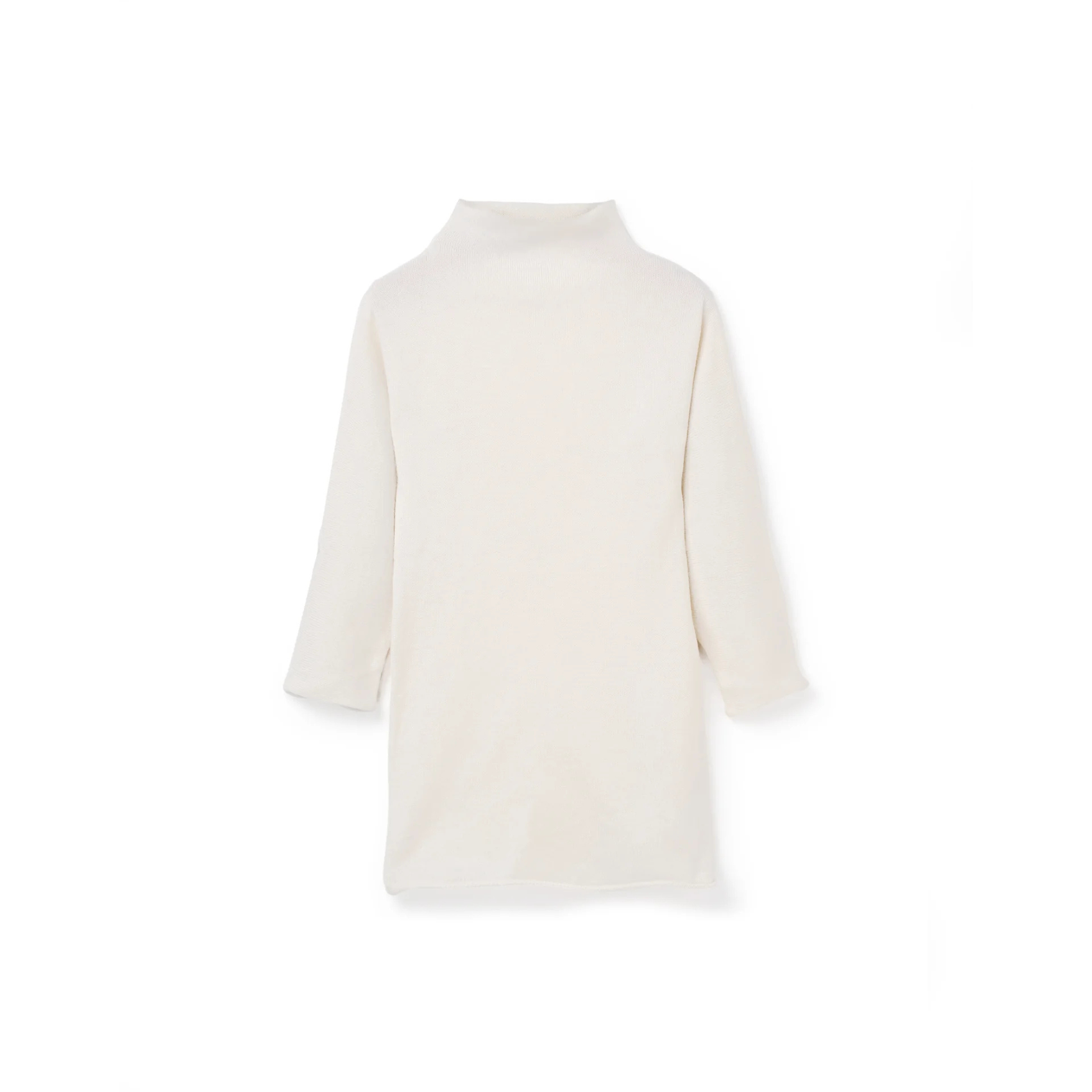 Merino cashmere funnel neck dress in snow white. The funnel dress is one of our signature styles and is available in an assortment of muted shades. Knitted in luxuriously soft merino and cashmere with a stretchy high neck and fitted silhouette. Comfortable to wear whilst being supremely stylish. The perfect addition for your little one's wardrobe.