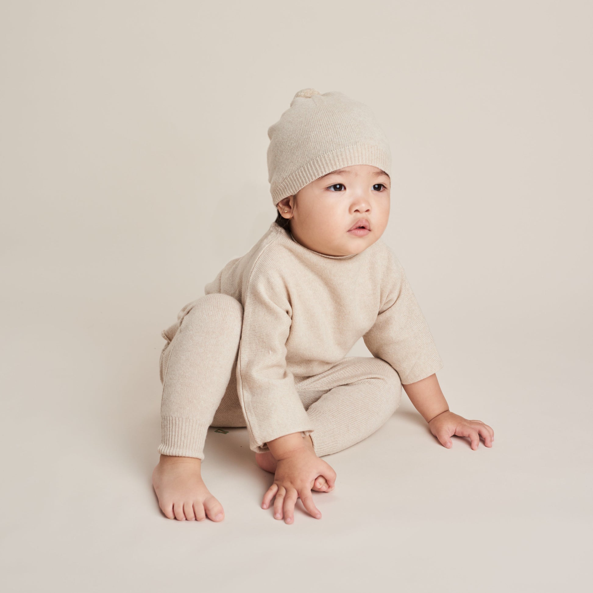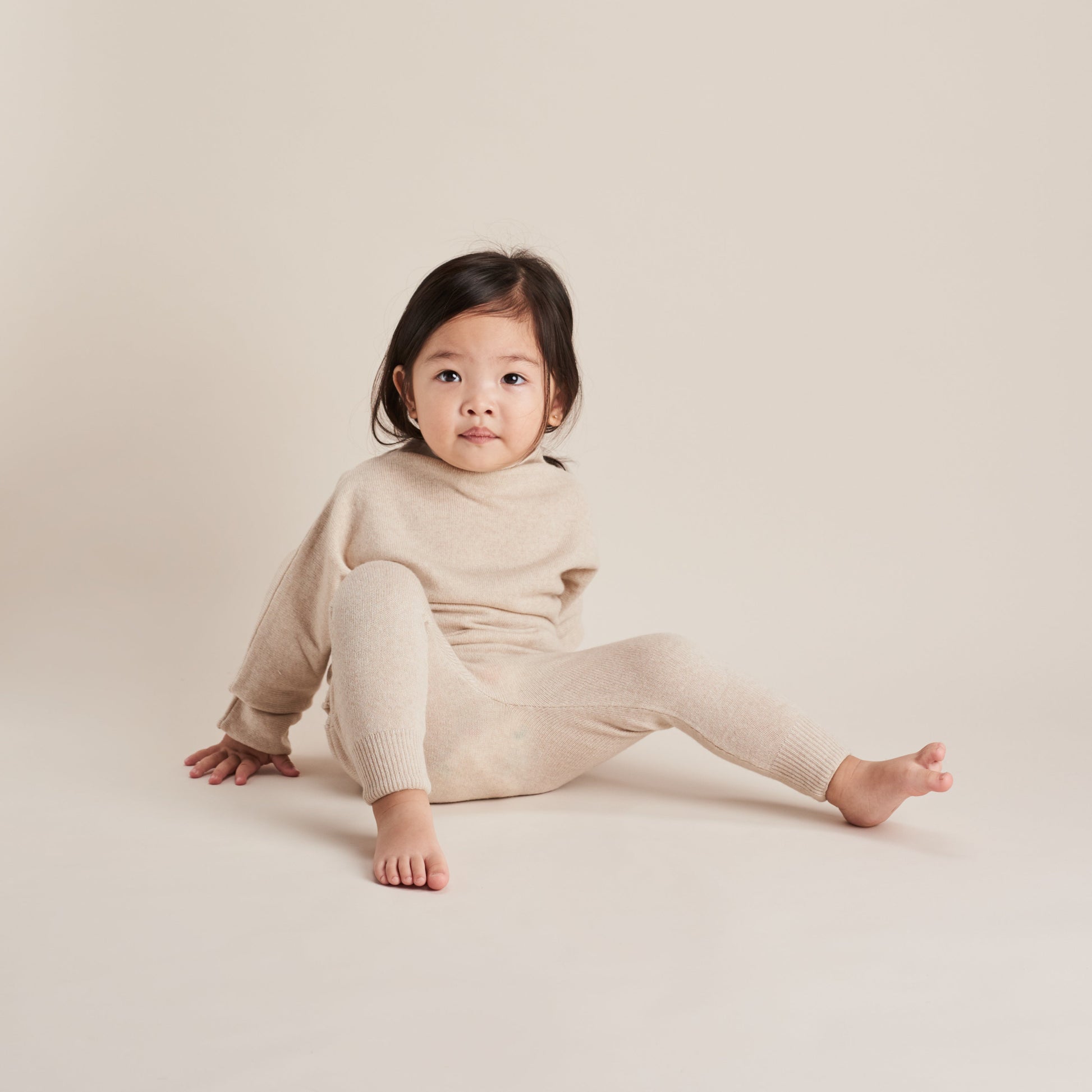 Merino cashmere funnel sweater and legging set in oatmeal marl. This coordinating set is luxuriously soft and easy to wear. An elevated everyday essential for baby.