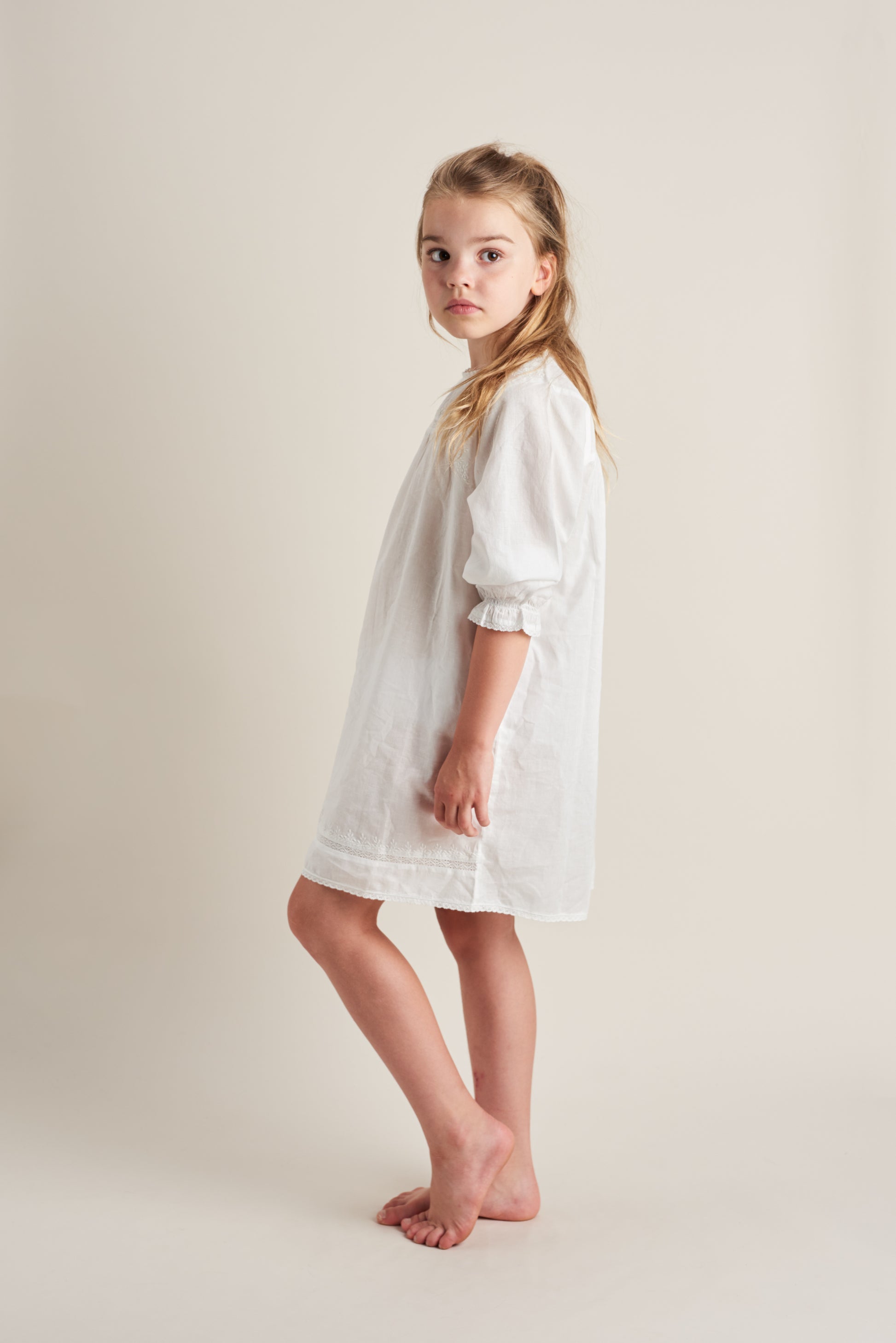 We love this soft, washed cotton dress. Cotton lace and a delicate floral embroidery adds a vintage style charm. Gorgeous worn with bare legs or knee high socks and sandals.