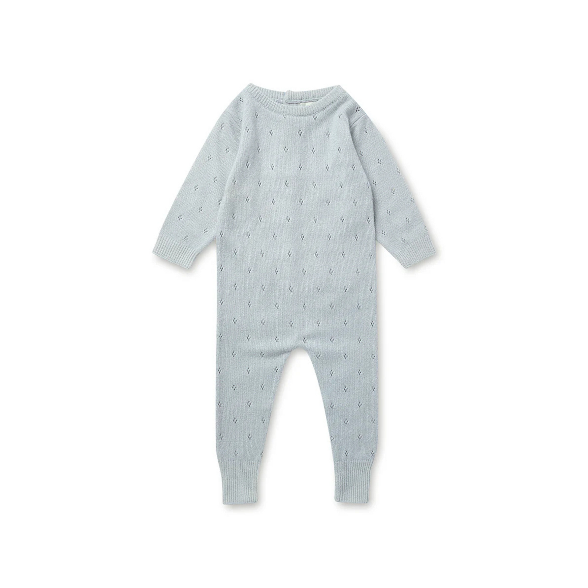 Merino cashmere romper with a pointelle knit design, in cloud blue. Luxuriously soft, with ribbed cuffs and buttons at the back. Pair with the matching bonnet for an adorable baby outfit.