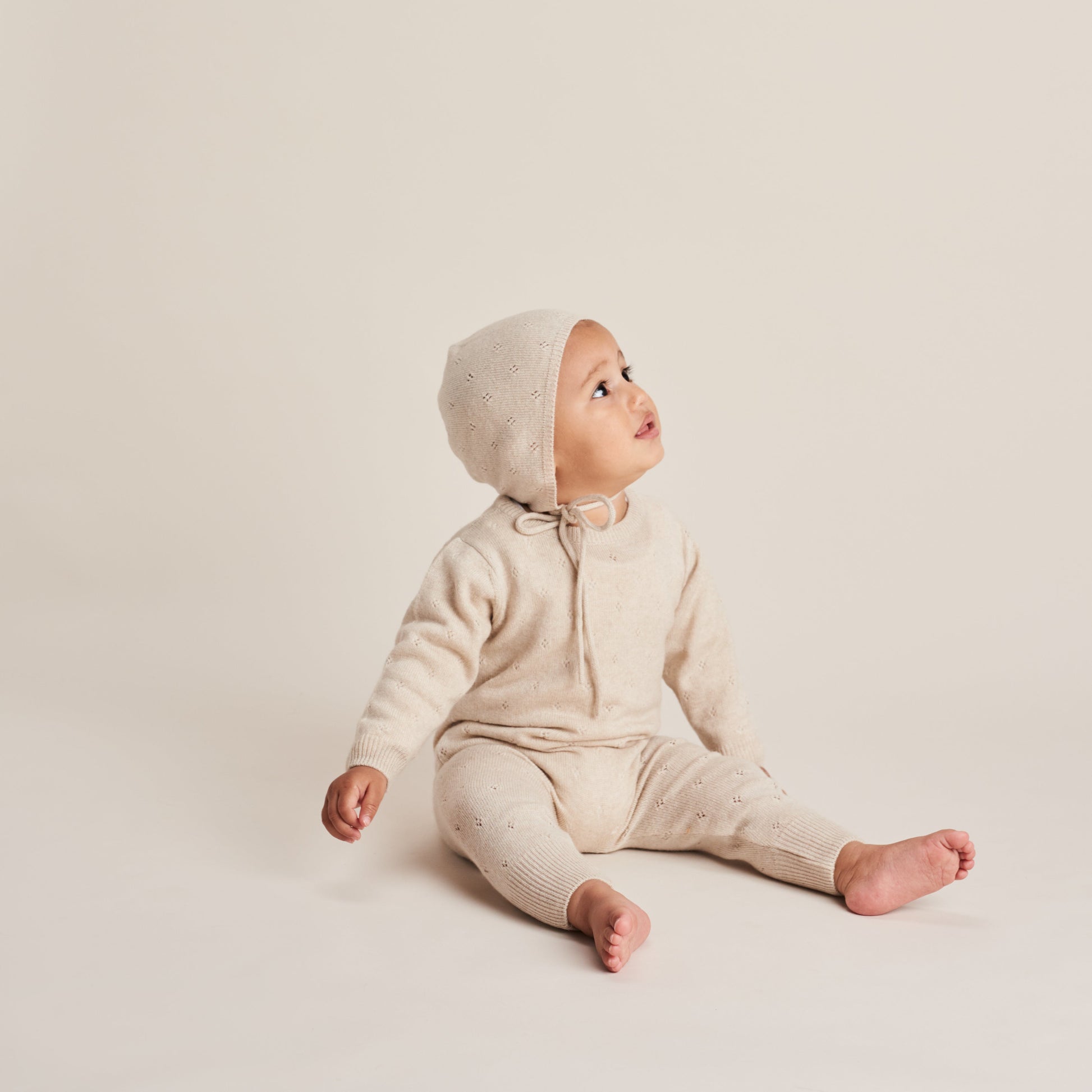 Merino cashmere romper with a pointelle knit design, in oatmeal marl. Luxuriously soft, with ribbed cuffs and buttons at the back. Pair with the matching bonnet for an adorable baby outfit.