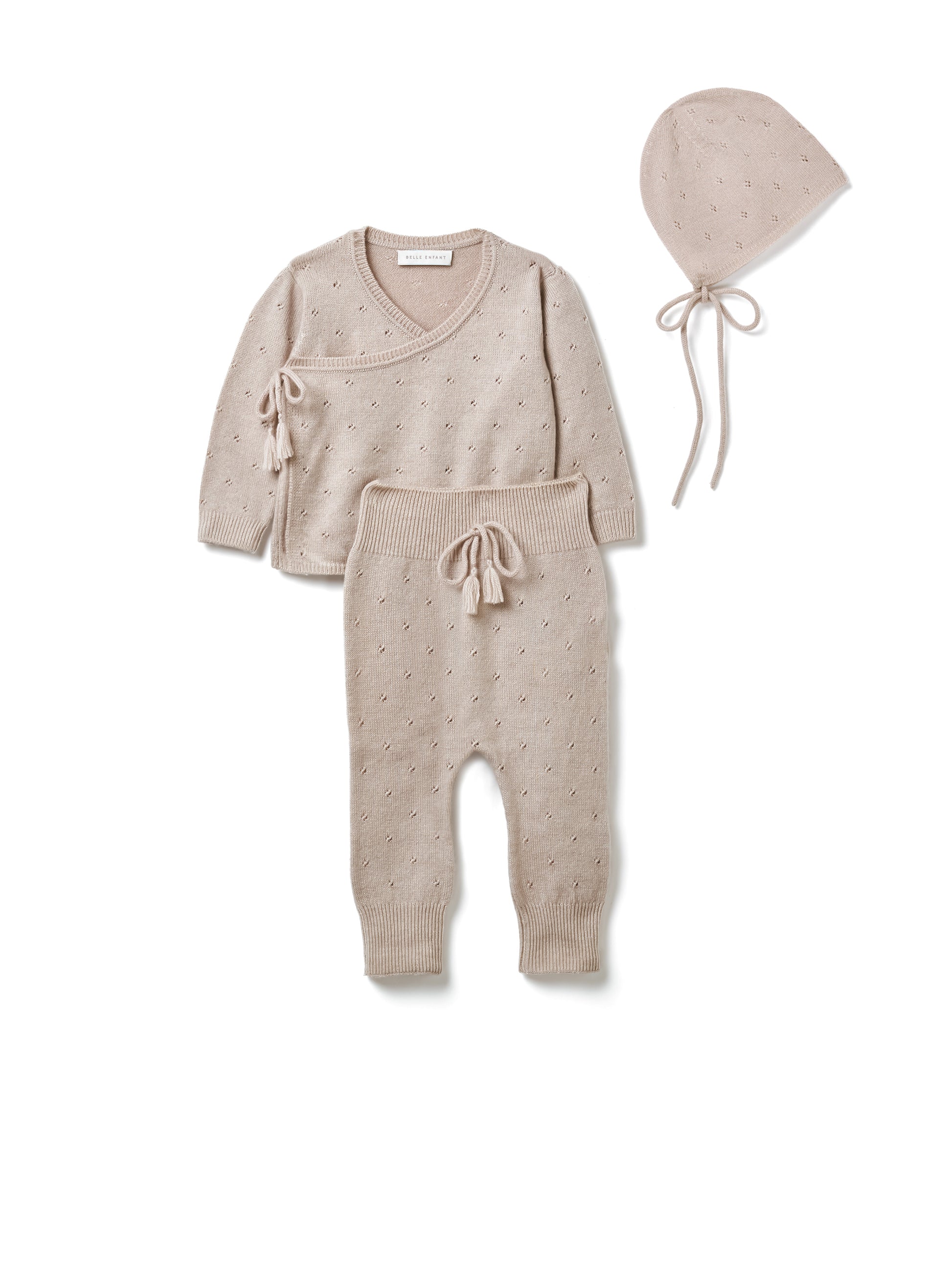 Merino cashmere wrap top, leggings and bonnet set with a pointelle design, in alabaster. Luxuriously soft and beautifully constructed. The perfect receiving gift for a new baby.