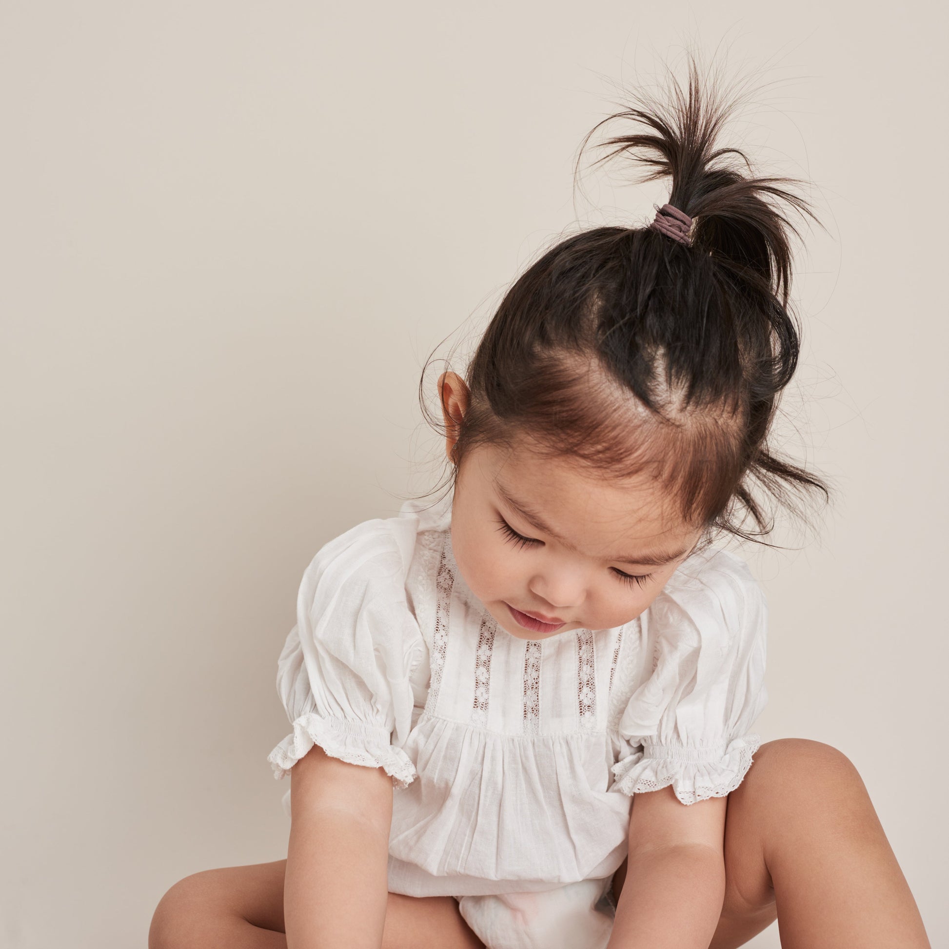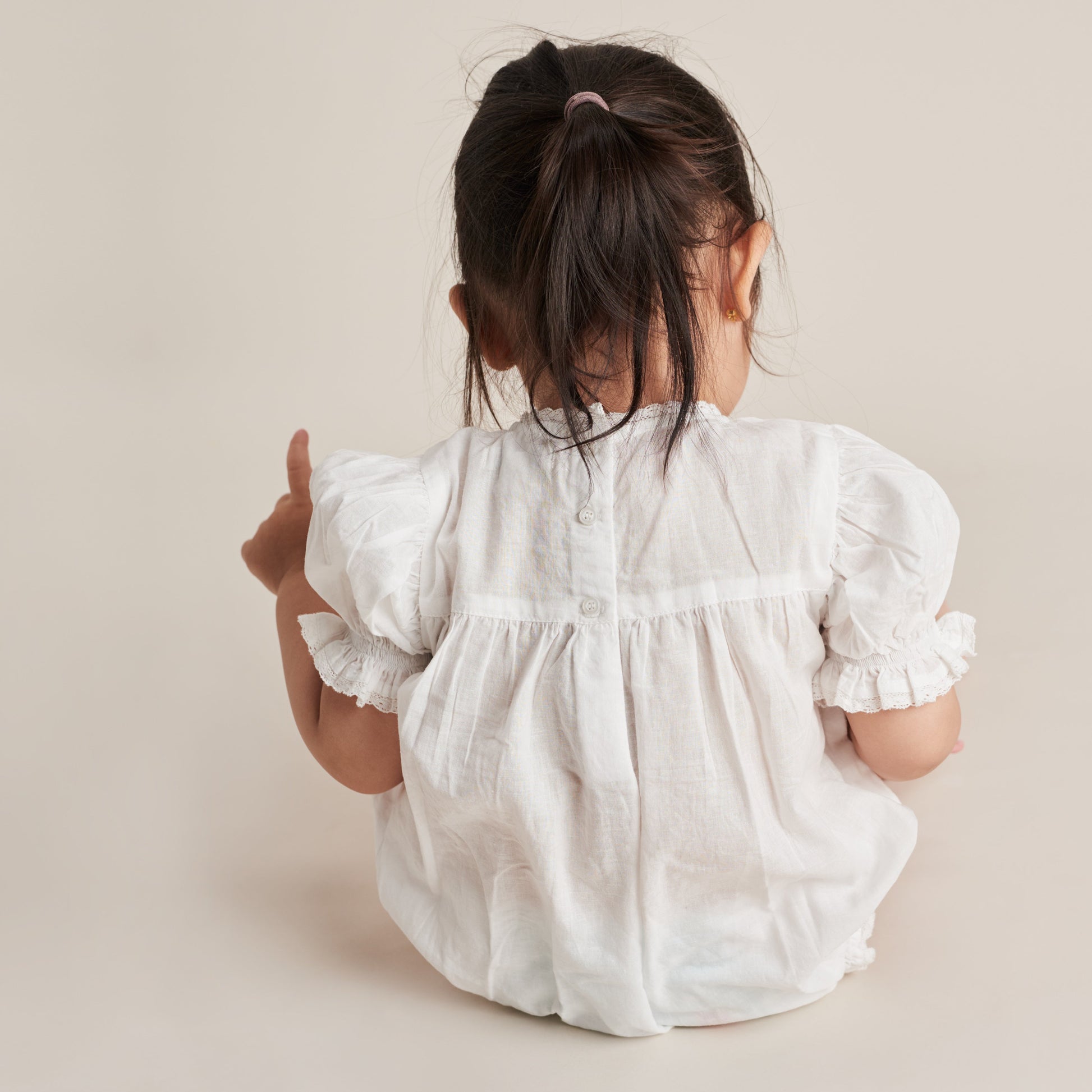 We love this puff sleeve romper with lace detailing, perfect for the summer. Cotton and a delicate embroidery add vintage style charm. Gorgeous worn with bare legs or tights.