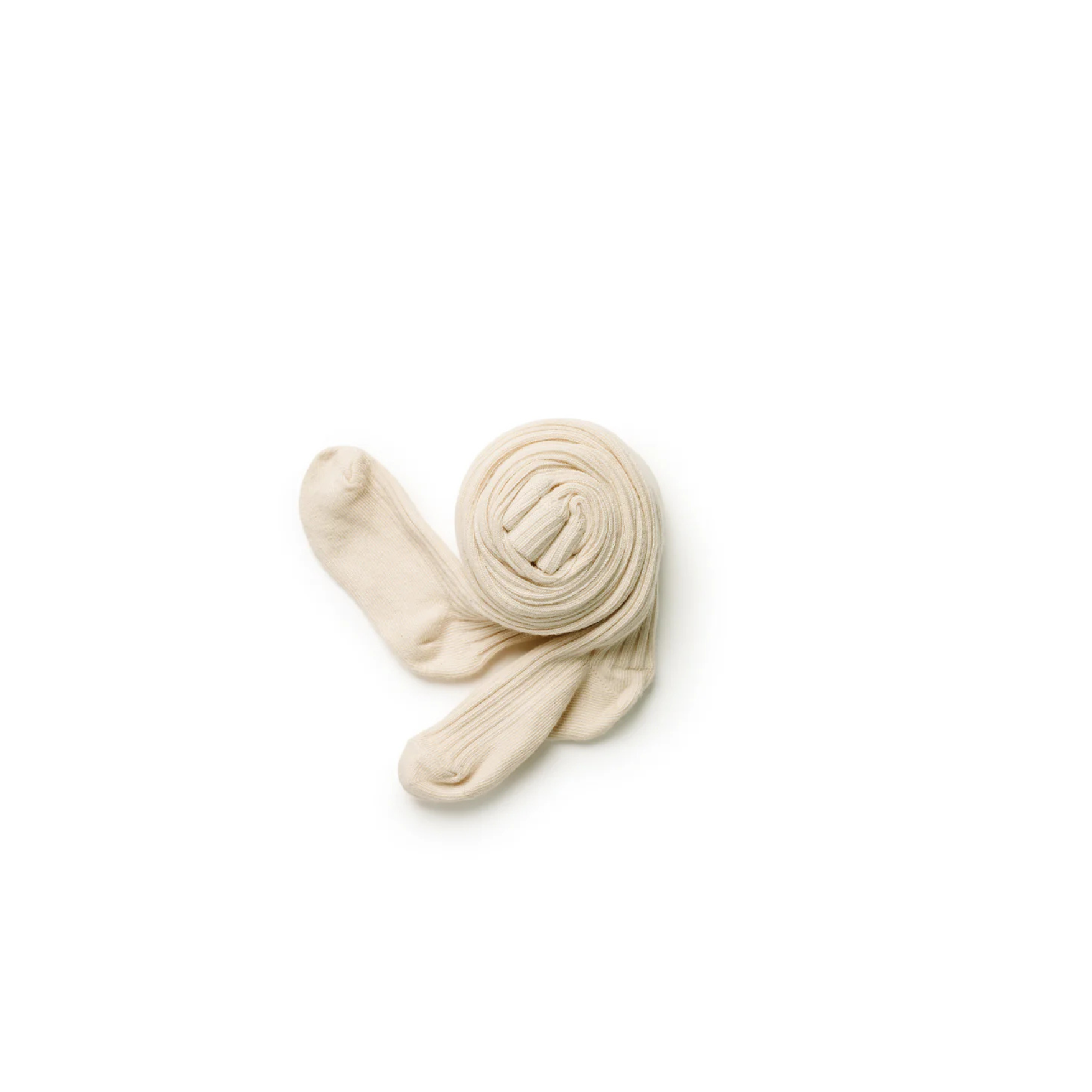 Ribbed tights in ecru. These gorgeous tights are a great addition to an outfit. Knitted from a cotton blend, in a thick, ribbed fabric. They are toasty and stylish. Perfect paired with the funnel neck dress.